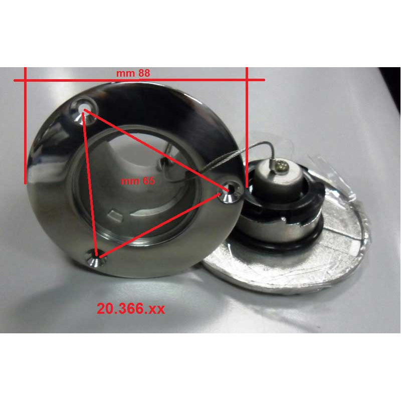 Caractéristiques techniques: fermeture par enclenchement avec rotation 45°; saillie 7,7 mm seulement; vis escamotables; câble inox de retenue avec ressort; versions fuel et diesel avec attache pour câble de masse; fabriqué en inox AISI 316 poli miroir; symboles réglementaires DIN. design déposé. Diamètre externe : 94mm. Saillie bouchon :7,7 mm.