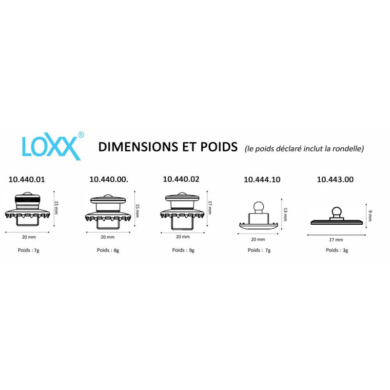 | Description | Outil spécial pour fixer les boutons “Tenax” et "Loxx" Attache femelle pour capote version tête grossie, Ø 15 mm pour une meilleure prise, pour tissus jusqu'à 3 mm Attache femelle pour capote version tête grossie, Ø 15 mm pour tissus très épais jusqu'à 7 mm Attache femelle pour capote, version standard, Ø tête 11 mm, pour tissus jusqu'à 3 mm Attache mâle avec vis autotaraudeuse inox. Longueur A 12 mm Attache mâle avec vis et écrou. Longueur A 10 mm Attache mâle avec plaque fixable avec vis ou rivets Attache mâle à frette moletée à fixer sur tissu 10.440.00 (Attache femelle pour capote version tête grossie, Ø 15 mm pour une meilleure prise, pour tissus jusqu'à 3 mm) + clé lot de 5 x 10.441.00 (Attache mâle avec vis autotaraudeuse inox. Longueur A 12 mm) lot de 5 x 10.442.00 (Attache mâle avec vis et écrou. Longueur A 10 mm) lot de 5 x 10.443.00 (Attache mâle avec plaque fixable avec vis ou rivets) lot de 5 x 10.444.10 (Attache mâle à frette moletée à fixer sur tissu) + clé Clé de montage |