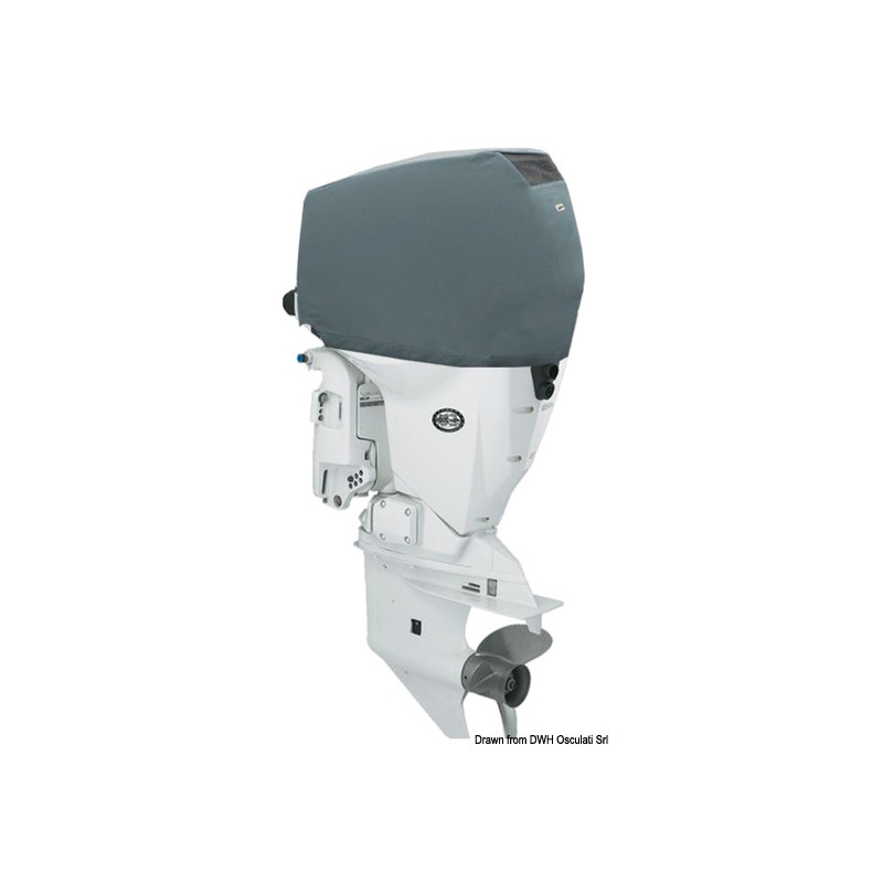 Housses de protection coupées sur-mesure pour les moteurs hors-bord Evinrude. En tissu gris-bleu. 2 versions au choix (à utiliser uniquement à l'arrêt ou également pendant la navigation) et plusieurs tailles selon la puissance et le modèle du moteur. Indiquées pour le stockage en plein-air.