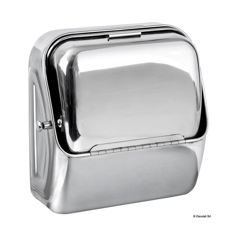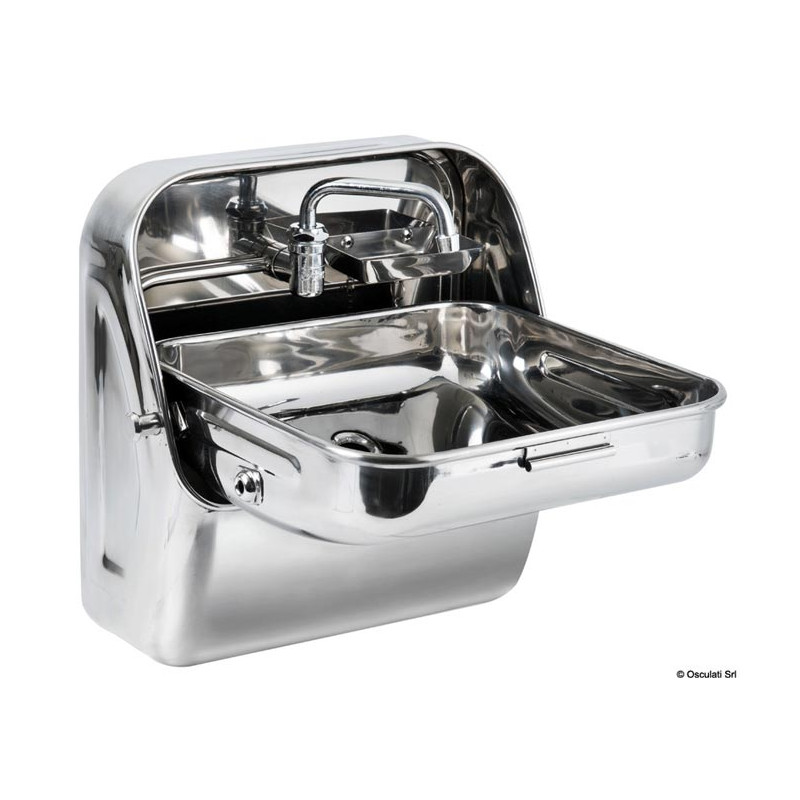 Rabattable contre le mur, avec son robinet incorporé en acier inox également avec ouverture et fermeture par rotation d'un côté ou de l'autre. Très résistant, on peut s'appuyer dessus sans l'endommager. Livré avec un porte-savon. Dimensions 375x320 mm, saillie fermée 145 mm, saillie ouvert 345 mm.