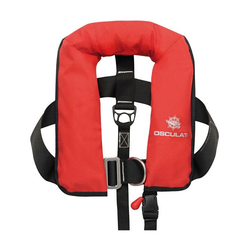 Gilet rouge. Activation automatique. Avec ceinture de sécurité conforme à la norme ISO 12401.