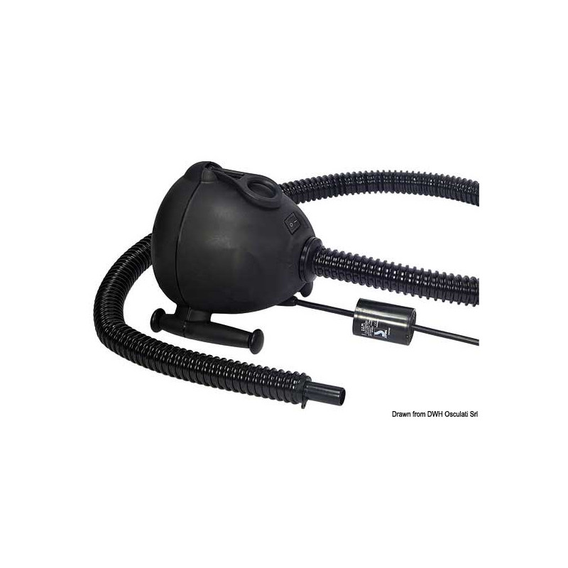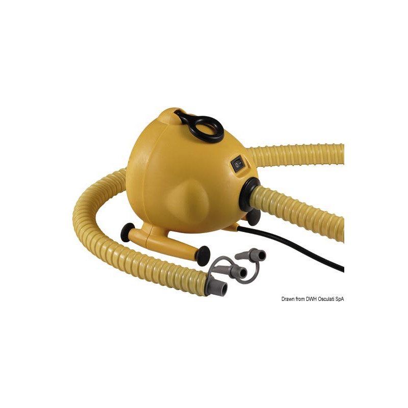 Il permet de gonfler et de dégonfler un canot de 4 mètres en moins de 4 minutes et de l'amener directement à une pression de 0,18 kg/cm2 (2,6 psi). Encombrement réduit, structure très robuste en fibre de verre/polycarbonate. Livré avec adaptateurs pour toutes les valves présentes dans le commerce. Grâce à sa turbine spéciale, c'est le premier gonfleur sur le marché dont la turbine tourne à 60 000 tours par minute, permettant de gonfler ou de dégonfler le canot en un temps record. Débit : 580 l/minute. Alimentation 12V.