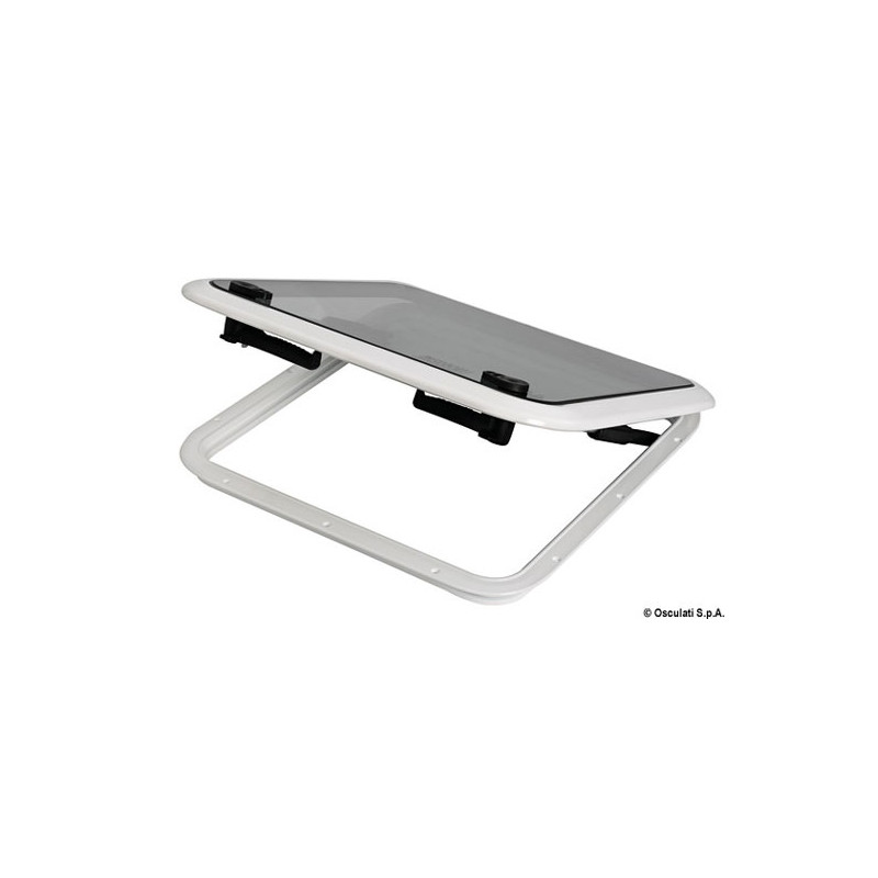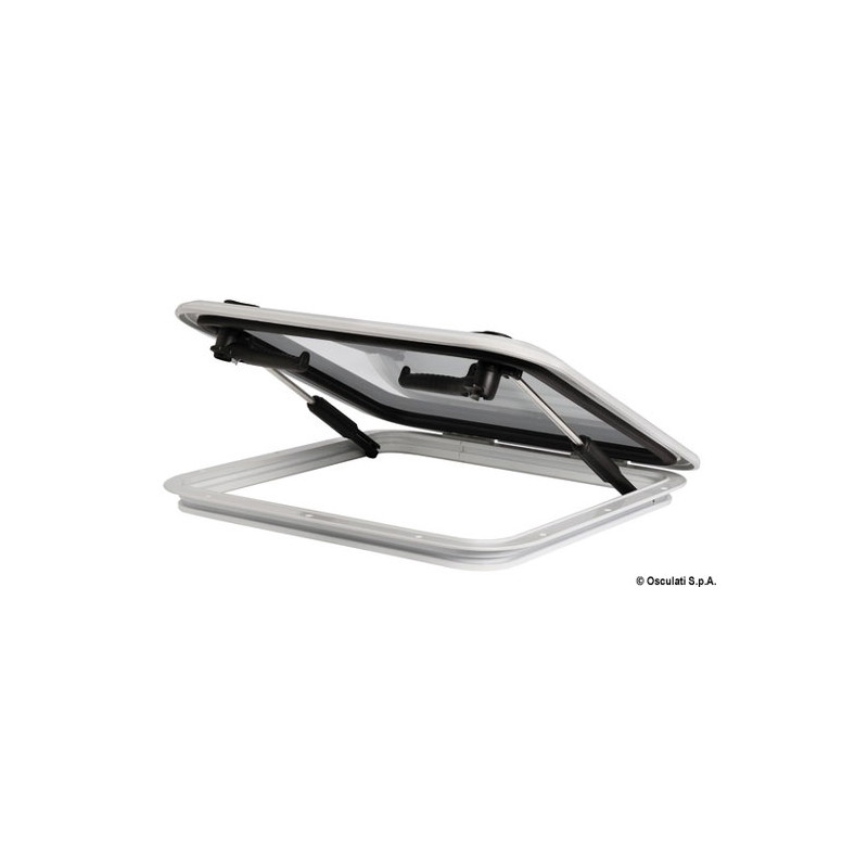 En alliage léger blanc epoxy et avec zone déclairage en verre trempé fumé, homologués CE. Charnières invisibles à lintérieur du profilé, ouverture à compas et position « ventilation ». Vente optionnelle de contre-brides, moustiquaires, pares-soleil et kits poignée externe. Adaptés à chaque modèle.