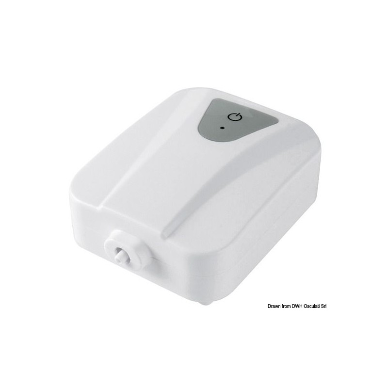 Pompe d'aération automatique pour viviers à poisson. Modèle à batterie rechargeable, compact et caréné.