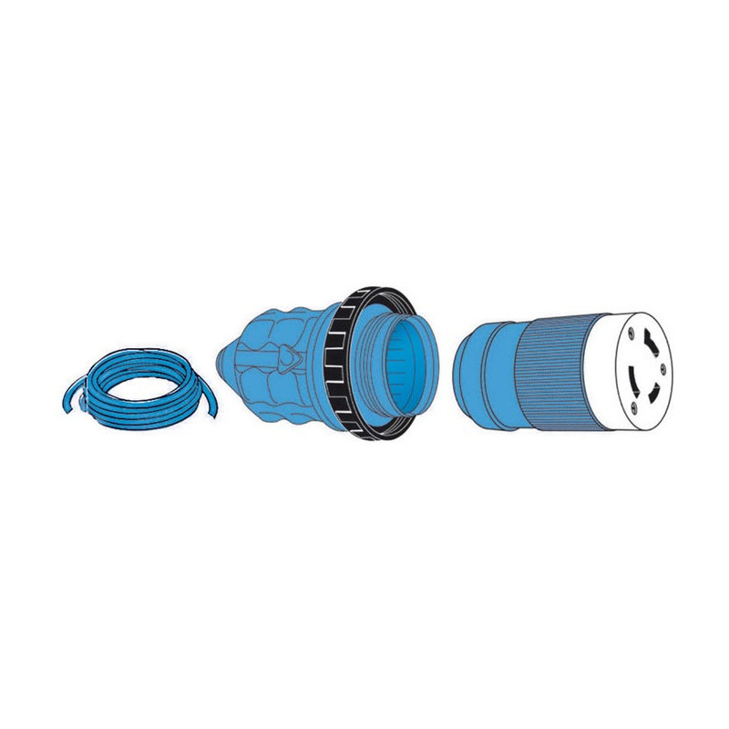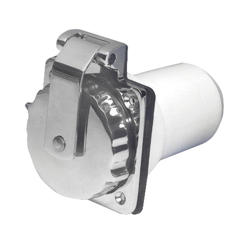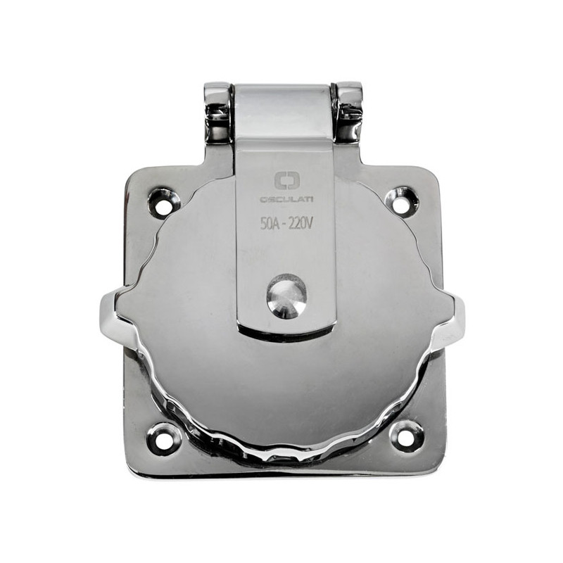 Prises: en inox AISI 316 poli miroir + polycarbonate, contacts en laiton nickelé et protection arrière sortie câbles. Fiche: polycarbonate + contacts en laiton argenté. Capuchon : de protection en PVC souple bleu électrique. 220/110 V et 60 A maxi.