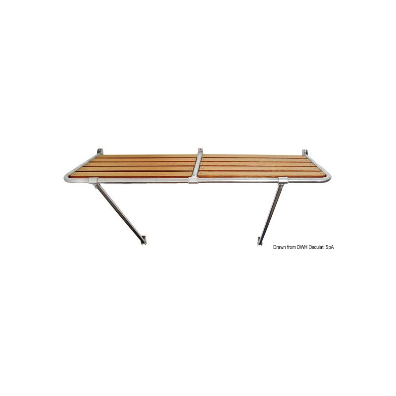 En tube inox AISI 316 Ø 25 mm poli, avec joints articulés. Plancher en Iroko.