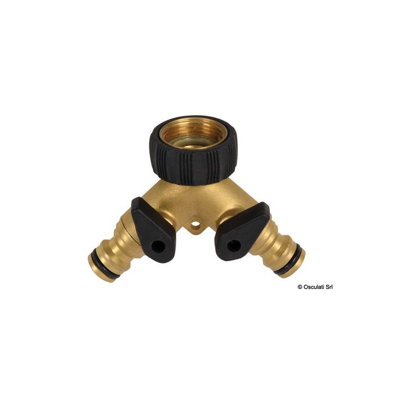Raccord à 2 voies pour brancher 2 conduites d'eau par enclenchement (raccord standard international). En laiton.