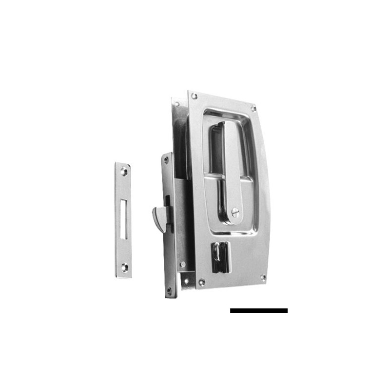 En laiton chromé pour portes coulissantes avec poignée à ras. La porte doit avoir une épaisseur minimum de 20mm. Ecusson de 112x15mm ; Plaque de 158x87mm. Version : avec clé d'un côté et verrou de l'autre.