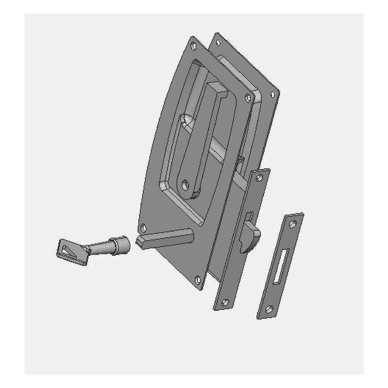 Serrure pour portes coulissantes avec poignée à ras + clé d'un côté et verrou de l'autre.