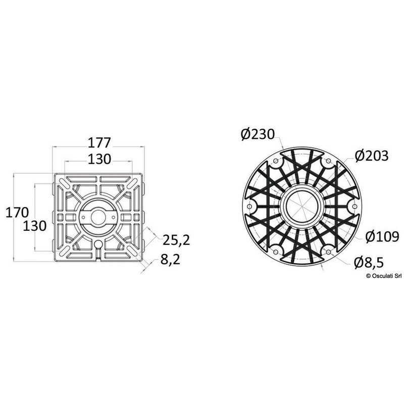 Pied / support de siège télescopique : Réglable en hauteur par ressort à gaz. Doté d'un amortisseur interne (Shock Absorber) pour absorber l'impact des vagues. Extractible de la base Ø 228 mm. Tubes en aluminium anodisé. Tête en nylon/fibre de verre avec perçage universel. Diamètre de la colonne : 75/65 mm.