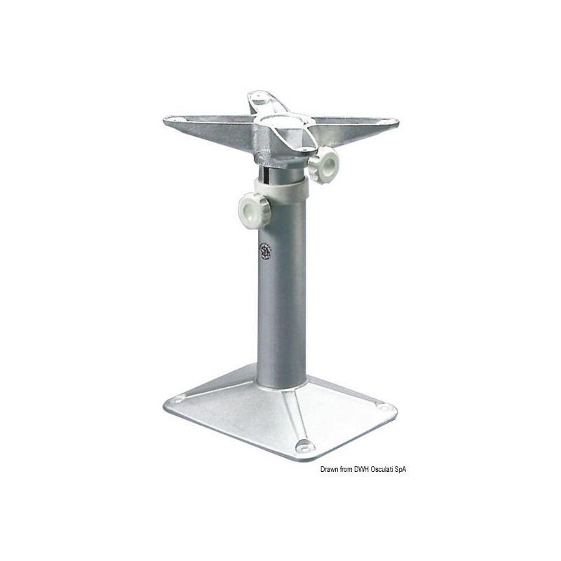 En alliage léger anodisé, à soulèvement automatique par ressort à gaz. Base extrêmement basse, pour minimiser lencombrement au niveau des pieds. Rotation à 360° - Ø colonne 80/73 mm - Hauteur 47/72 cm - Châssis 24,(x34 cm.