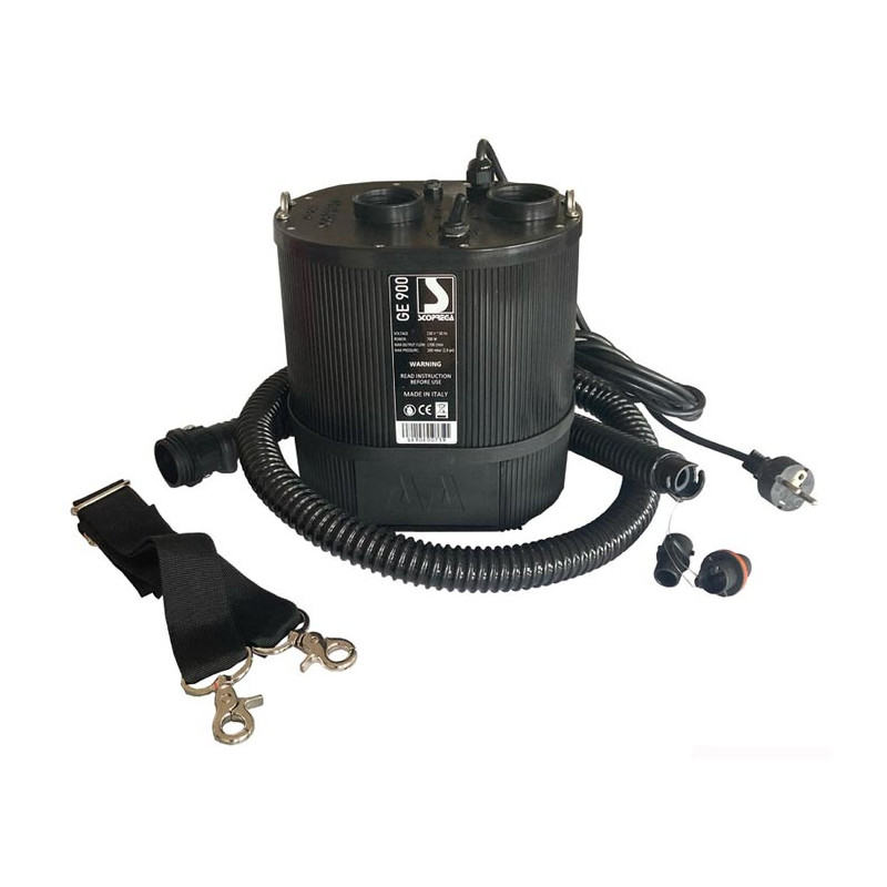 Modèle à très haute performance, pour gonfler n'importe quel type de canot pneumatique ou structure gonflable en quelques secondes et avec peu de bruit (max 85 dB). Livré avec raccords, tuyau de gonflage et sangle de transport.