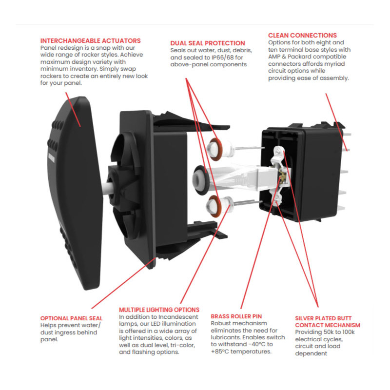 Interrupteurs Contura II - Carlingswitch. étanches IP56. Différents modes d'éclairage et voltages.