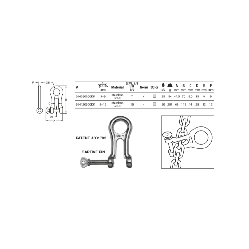Manille de mouillage pour raccorder rapidement une seconde ancre sur la chaîne principale. Une manille classique est en effet souvent difficile à introduire dans les maillons serrés d'une chaîne calibrée.
